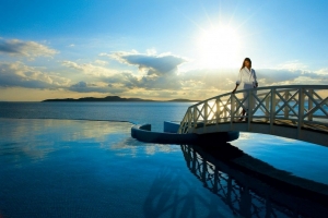 Nel Saint John Hotel, i bordi infiniti della piscina si fondono impercettibilmente con le acque turchesi della baia privata.